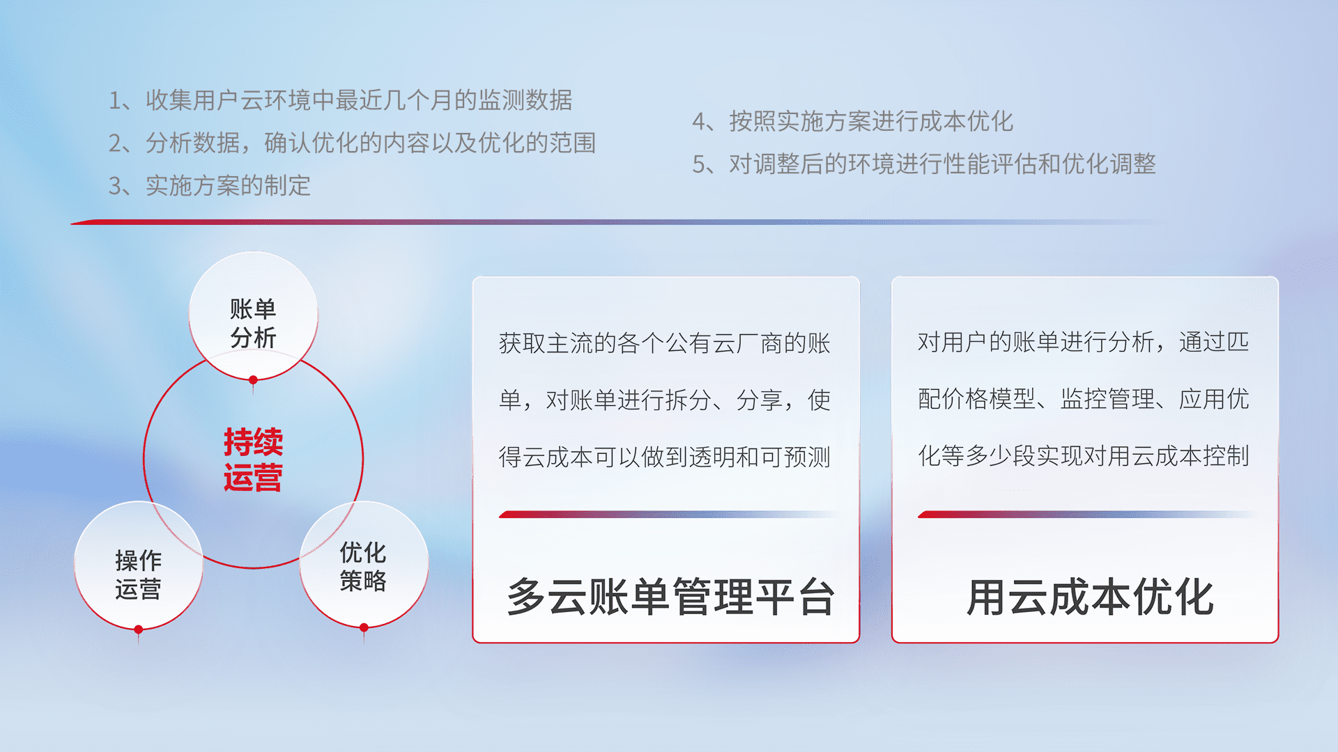 通过灵活运用多种自动化迁移工具,,帮助企业用户实现业务和数据高效 、、、稳定的上云迁移和云上迁移,,采用自研多云纳管平台,,,以中立管理模式,,,解决多组织、、多云、、、、多运维厂商的复杂关系的管理,,,,保证多云平台资源配置的一致性,,,实时掌控云资源运行数据,,,运用智能化工具分析云资源多云平台的管理服务,,透明化管理成本支出,,,,用云成本可预测、、、用云费用可优化、、云资源配额有据可依。。