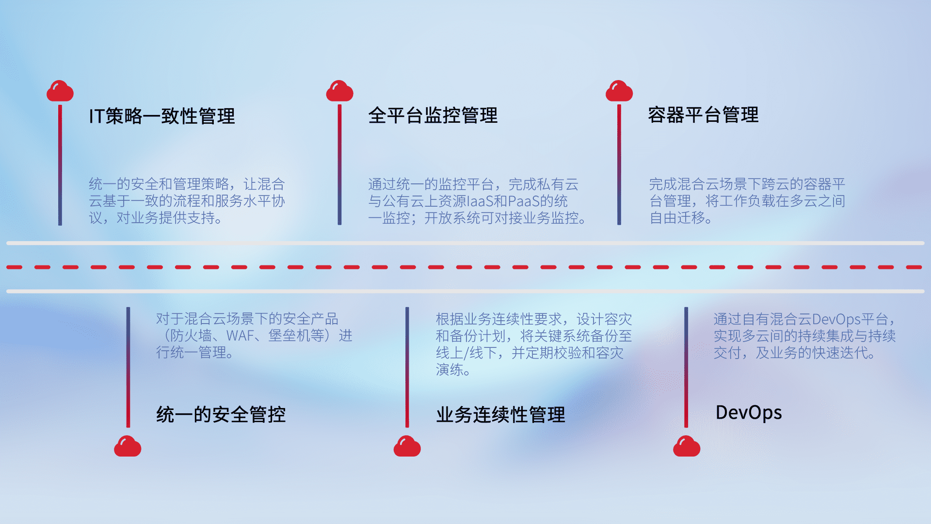 以中立管理模式,,,,解决多组织、、、、多云、、、、多运维厂商的复杂关系的管理,,,保证多云平台资源配置的一致性,,,,实时掌控云资源运行数据。。。。